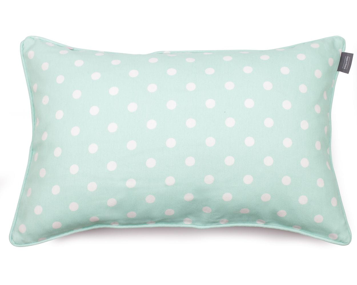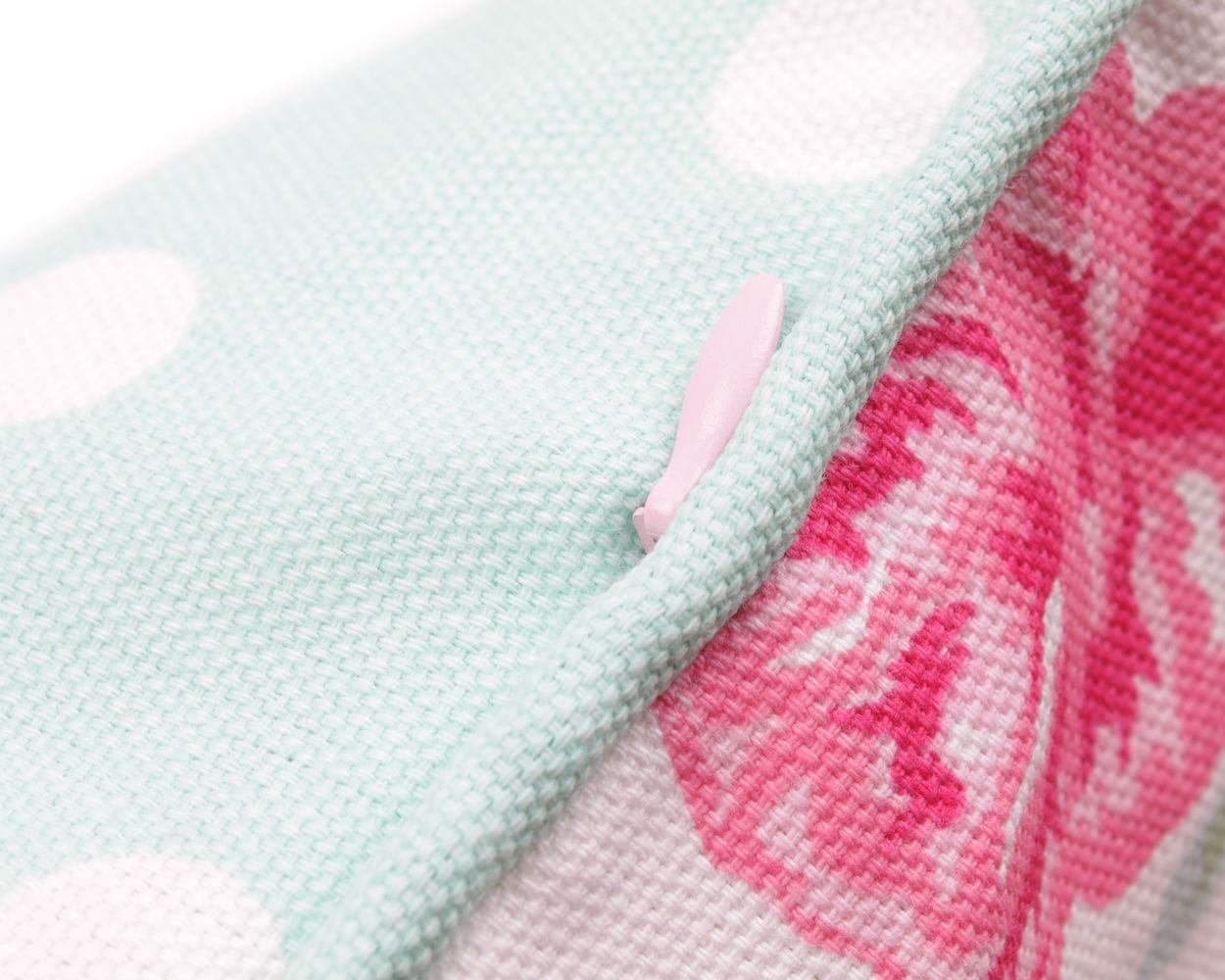 Das dekorative Kissen auf der einen Seite hat ein klassisches Rosenmotiv auf weißem Hintergrund, auf der anderen Seite einen Minzhintergrund mit weißen Punkten. Der Ziegel-Design-Effekt. Der Kissenbezug passt wunderbar zu klassischem Interieur, passt aber auch zu modernen Trends.