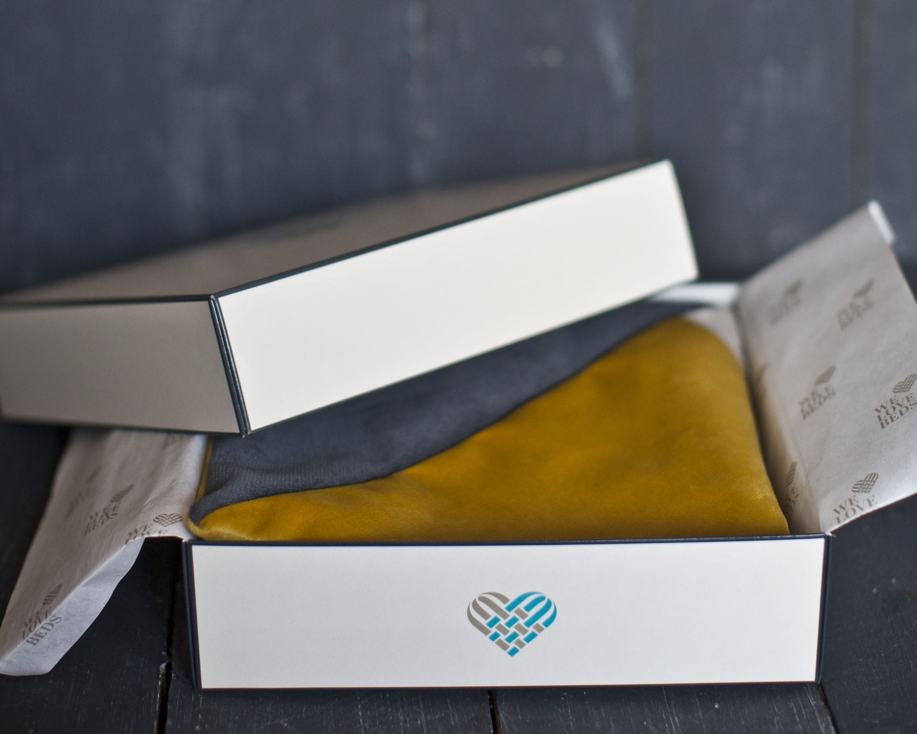 Jedes Produkt ist in einem Kreidekarton verpackt, der mit Musselinpapier gepolstert ist. Das Kissen ist daher perfekt als ein einzigartiges Geschenk.